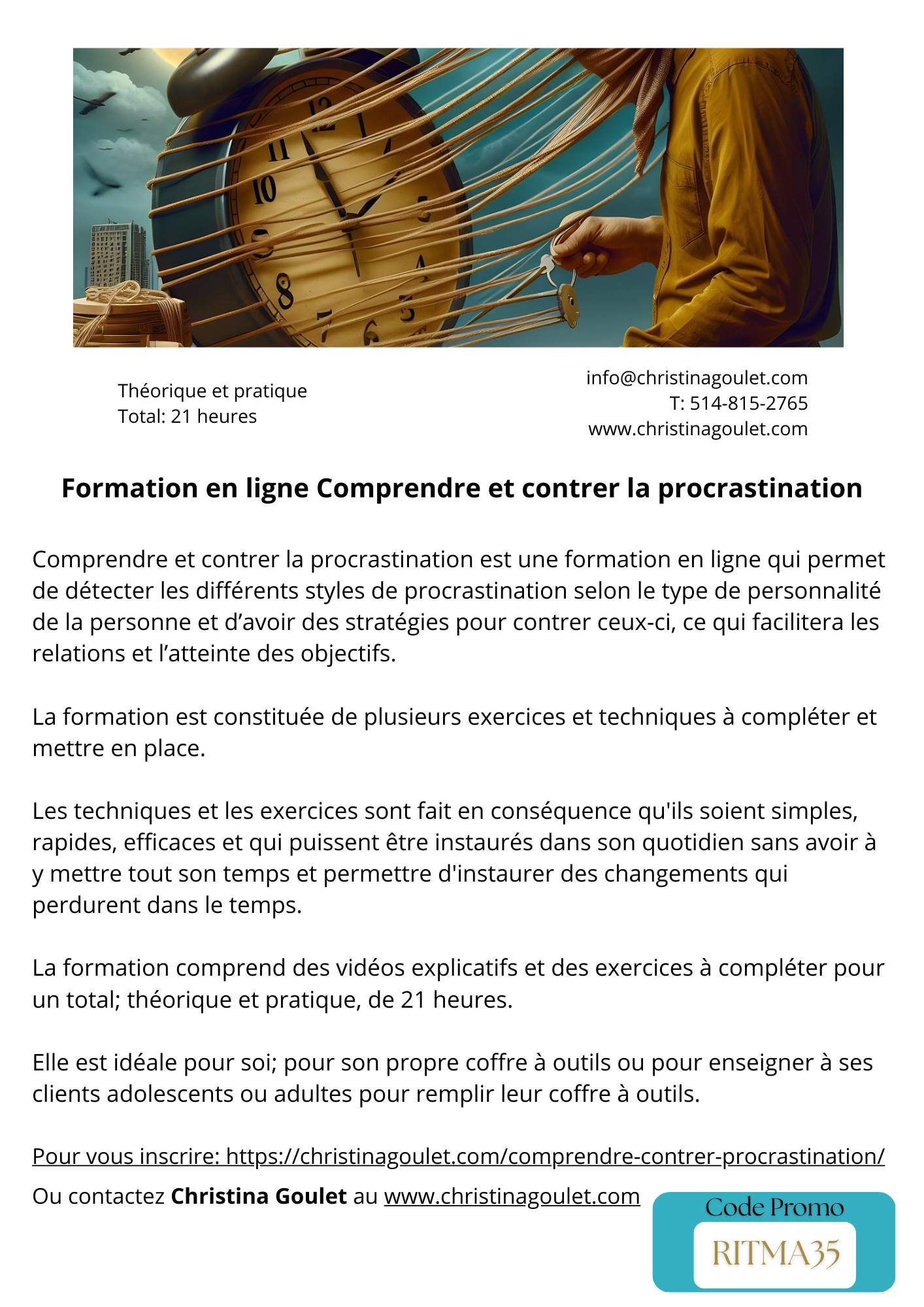 Comprendre et contrer la procrastination (21heures): https://christinagoulet.com/comprendre-contrer-procrastination/